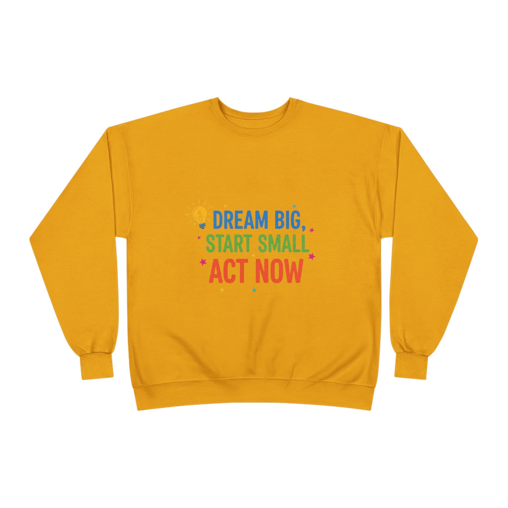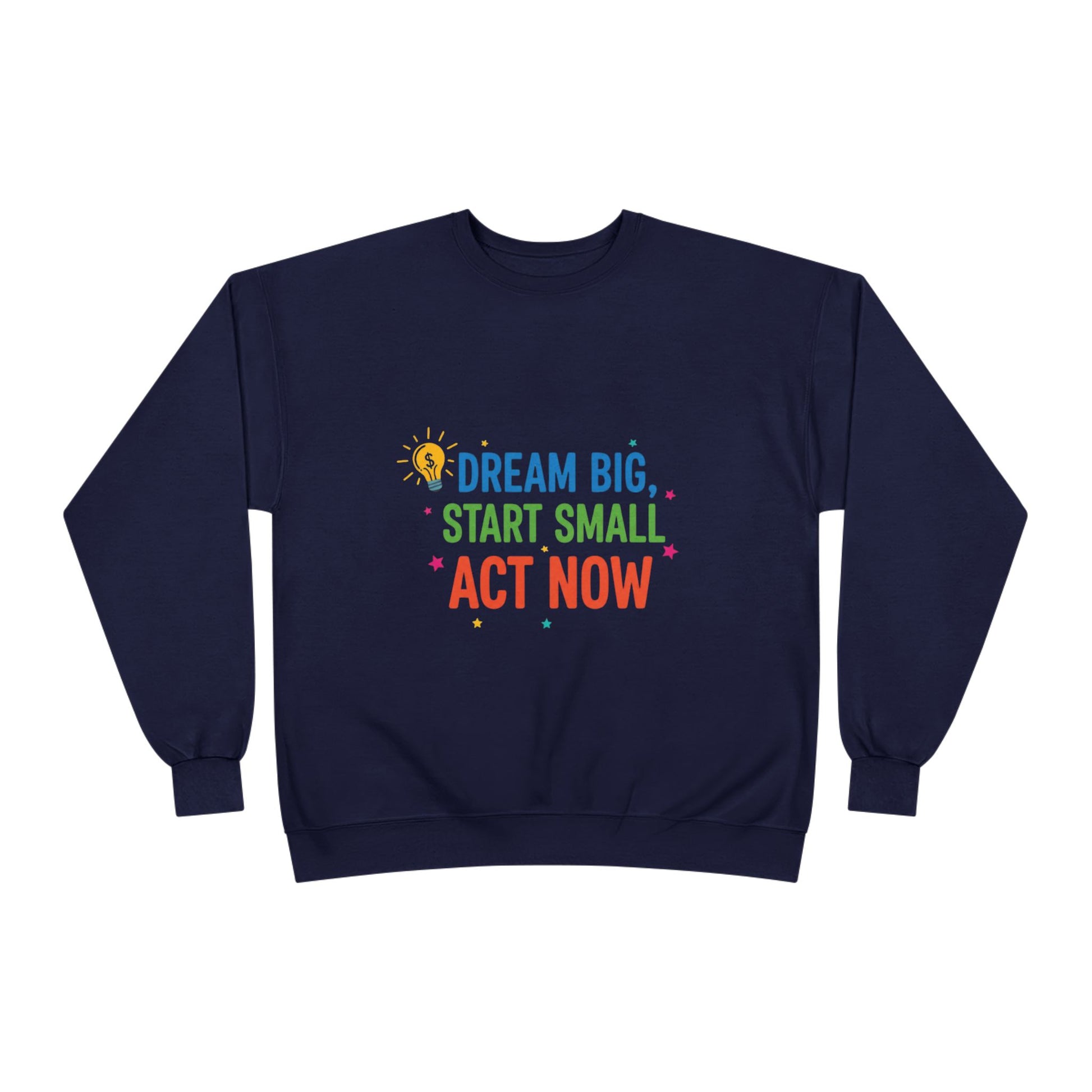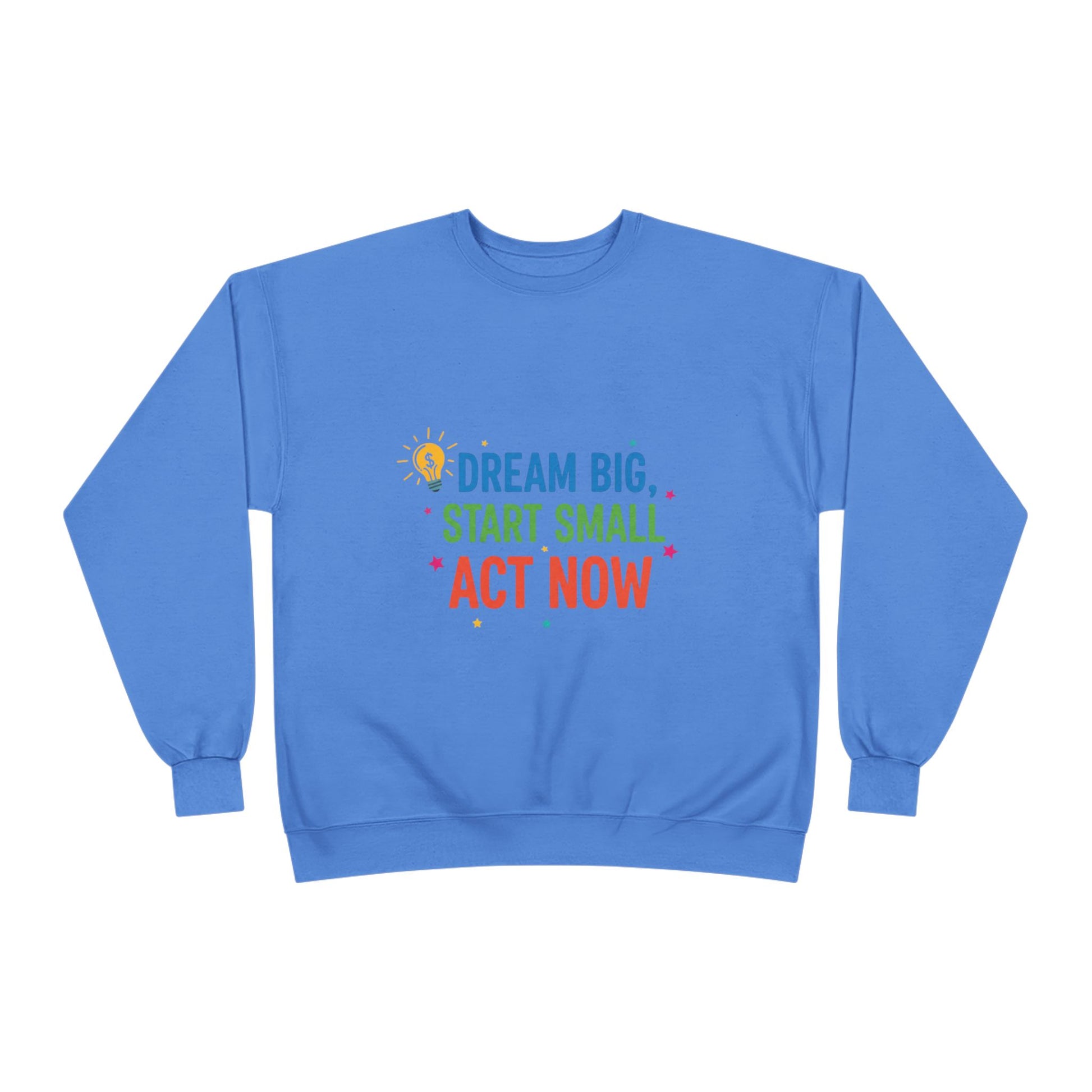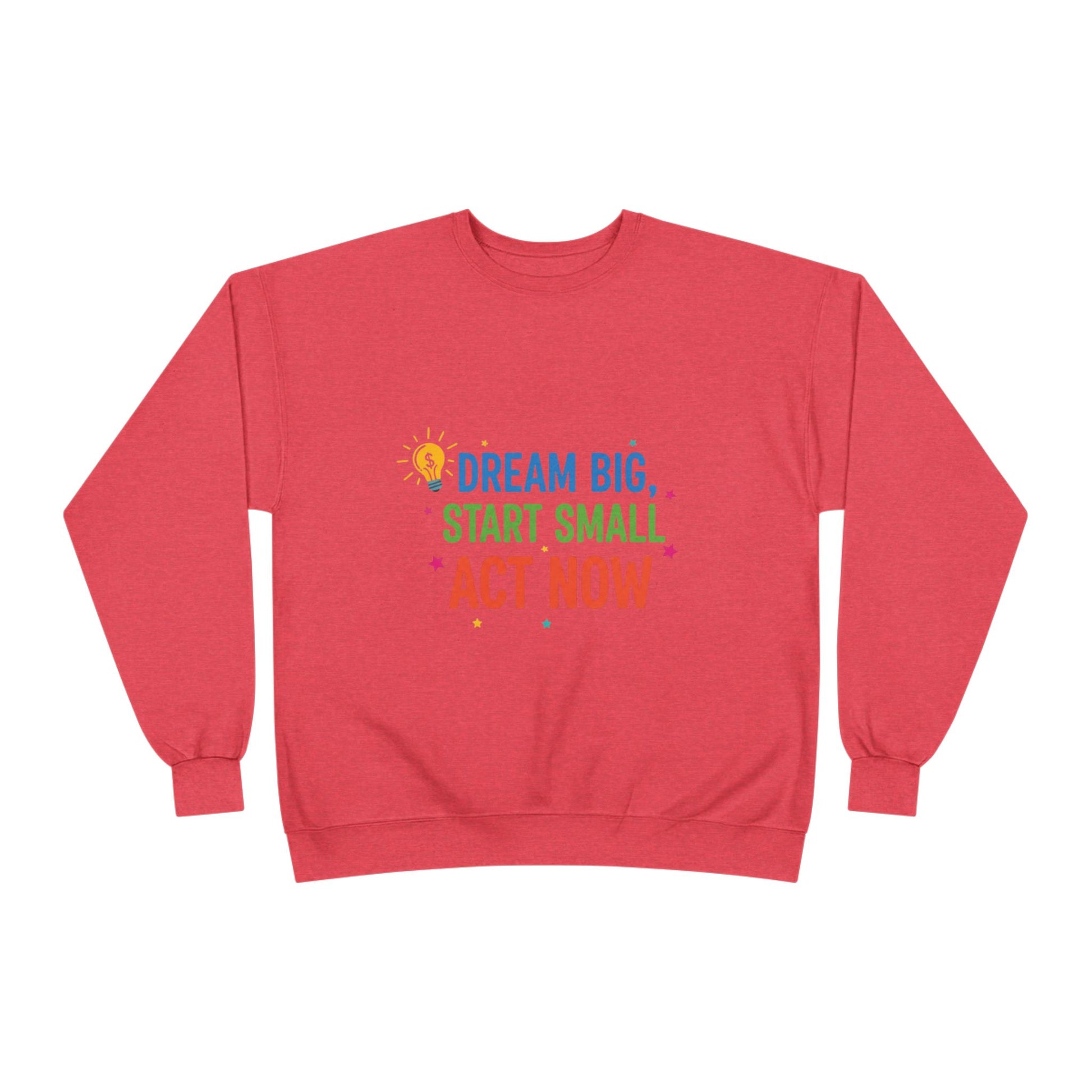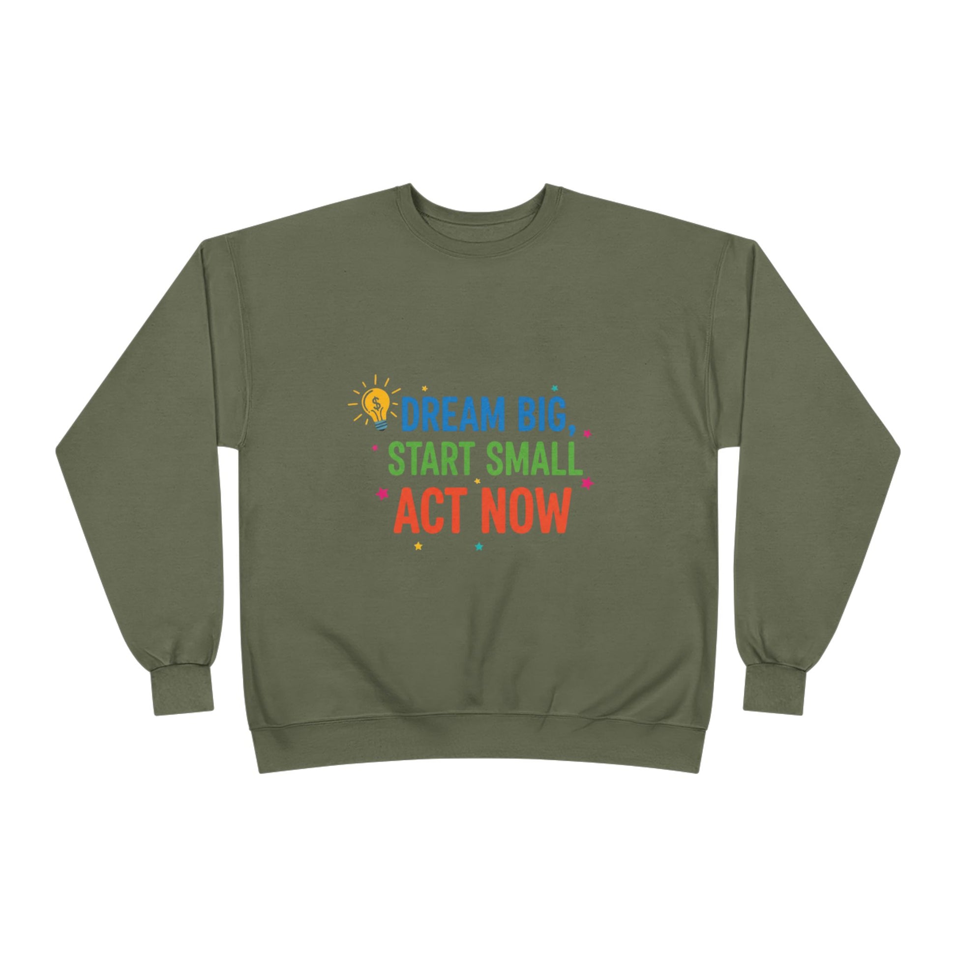 Embrace a positive mindset with this cozy Unisex EcoSmart® Crewneck Sweatshirt, designed for dreamers and doers! Its uplifting message, 'Dream Big, Start Small, Act Now,' encourages you to take those first steps towards your goals. Perfect for casual outings, cozy nights in, or as a motivational piece for your daily activities, this sweatshirt adds a touch of inspiration to your wardrobe. Ideal for creatives, entrepreneurs, or anyone who believes in the power of growth, it makes a thoughtful gift for graduations, birthdays, or just because. Celebrate the spirit of new beginnings during the New Year, or show your support during Mental Health Awareness Month with this stylish and impactful piece.