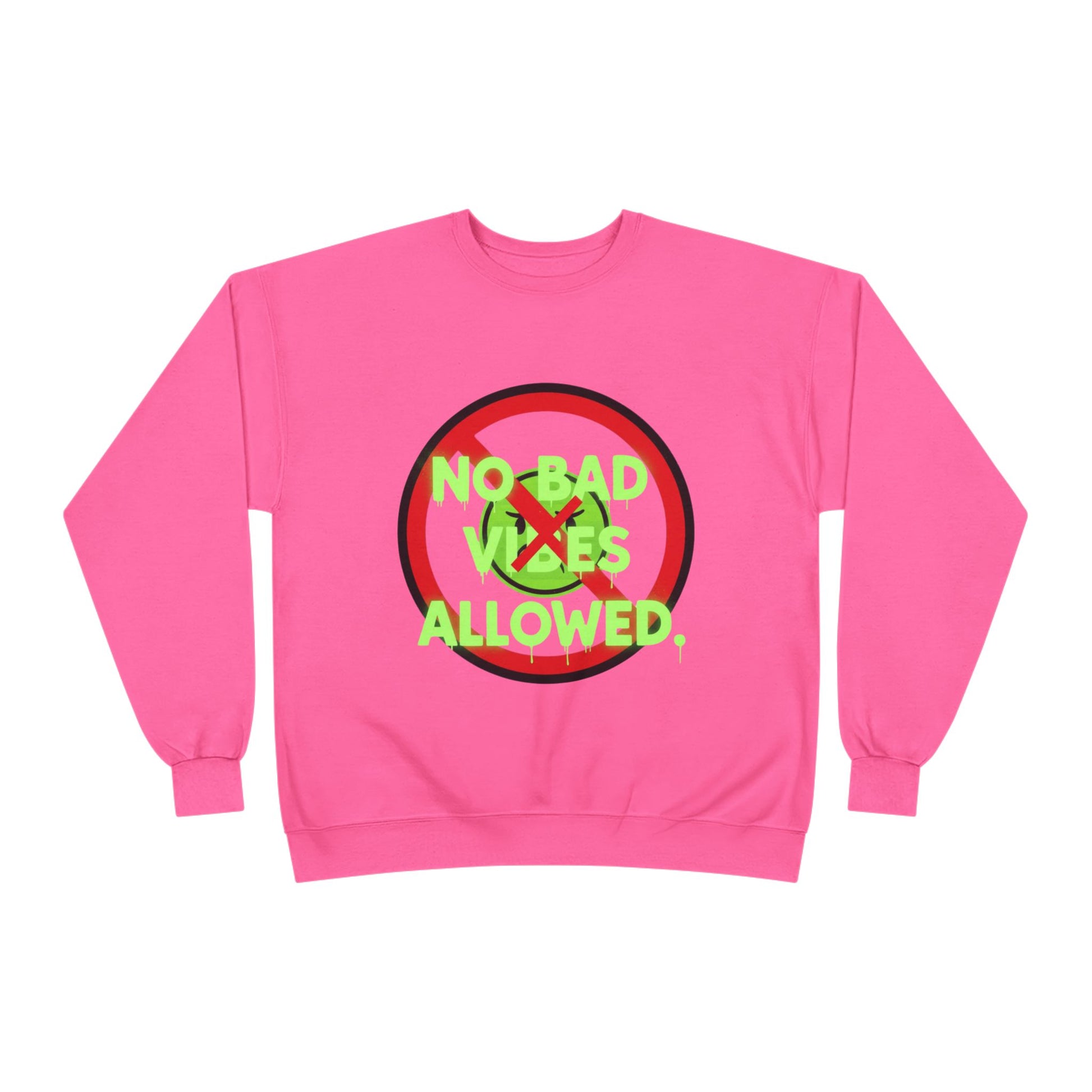 Embrace comfort and style with this unisex EcoSmart® crewneck sweatshirt. The vibrant design featuring "No Bad Vibes Allowed" sets a positive tone, making it an ideal choice for casual outings, lounging at home, or cozy gatherings with friends. Perfect for those who love to show off their upbeat attitude, this sweatshirt fits seamlessly into your life, offering warmth and a relaxed vibe. It's great for everyday wear as well as special occasions like birthdays, holidays, or simply when you need a pick-me-up. This sweatshirt makes a thoughtful gift for friends and family who cherish positivity and comfort in their wardrobe!